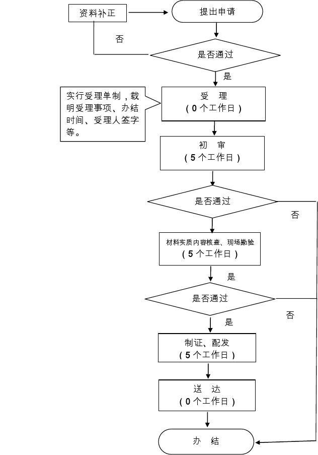 环节名称:收件 ;办理人:宛坤;办理时限:即时;审查标准:申请人通过政务服务网、实体大厅进行事项的申请,提交有关申请材料和反映真实情况,并对其社情材料的实质内容的真实性负责。;办理结果:对申请人提交的申请材料进行审查; 环节名称:受理 ;办理人:焦玲;办理时限:即时;审查标准:工作人员通过窗口或者河南政务服务网接受申报材料;办理结果:所交材料不齐全或不符合法定要求的,签发《一次性告知书》。如所交材料存在可以当场更正的错误,申请人可当场更正。如所交材料齐全,应当场作出是否受理决定。; 环节名称:审核 ;办理人:王东;办理时限:0.5天;审查标准:根据法定条件和程序,对申请材料的实质内容进行核实;办理结果:根据法定条件和程序,对申请材料的实质内容进行核实,材料及内容无误递交决定岗; 环节名称:决定 ;办理人:王东;办理时限:0.5天;审查标准:根据法定条件和程序作出行政许可决定;办理结果:作出行政许可决定; 环节名称:送达 ;办理人:宛坤;办理时限:即时;审查标准:将许可证书邮寄或当面送达申请人;办理结果:将许可证书邮寄或当面送达申请人;
