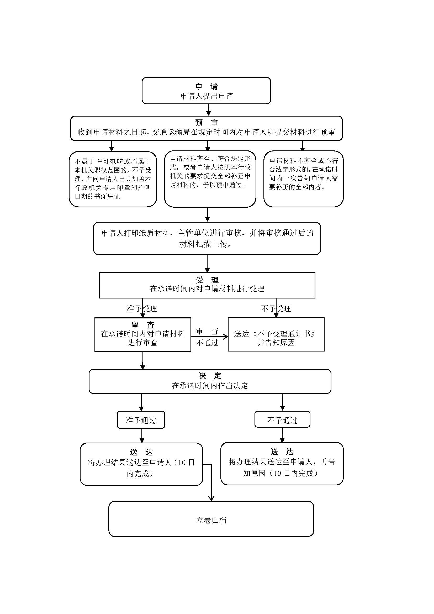 环节名称:收件;办理人:交通局窗口收件人员;办理时限:1小时;审查标准:申请人向登记(发照)机关窗口提交申请材料,或在河南政务服务网进行网上申报,并选择结果送达方式。;办理结果:符合申请条件转交窗口受理人员办理。; 环节名称:受理;办理人:交通局窗口受理人员;办理时限:2小时;审查标准:对申请材料进行初步审核。经审核,申请材料齐全、符合法定形式的,决定予以受理。对申请材料不齐全或者不符合法定形式的,应当当场告知申请人需要补正的全部内容并即时决定不予受理,并告知申请人。;办理结果:1. 材料齐全符合法定形式的出具《受理通知书》; 2.材料不齐全或不符合法定形式的出具《不予受理通知书》。; 环节名称:审核;办理人:交通局窗口许可审核人员;办理时限:2小时;审查标准:提交材料是否齐全、是否符合法定形式;材料需要核实的,核实相关材料。;办理结果:对于审核通过的,作出许可或备案决定,送达准予许可或备案决定;对于审核不通过的,作出不予行政许可或备案的决定,《不予许可决定书》或《不予备案决定书》。; 环节名称:决定;办理人:交通局窗口许可决定人员;办理时限:2小时;审查标准:根据审核情况,作出准予登记或不予行政许可的决定。;办理结果:1.做出准予许可或备案决定的,送达相关文书; 2.做出不予行政许可或备案决定的,送达《不予许可决定书》或《不予备案决定书》。; 环节名称:送达;办理人:交通局窗口送达人员;办理时限:1小时;审查标准:根据申请人选择的送达方式送达结果文件。;办理结果:实施机关作出决定当日应通知申请人,及时向申请人颁发、送达审批服务事项办理结果。;