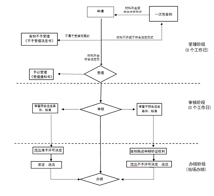 环节名称:受理;办理人:受理人员;办理时限:当场办理;审查标准:对申请材料进行初步审核。经审核,申请材料齐全、符合法定形式的,决定予以受理。对申请材料不齐全或者不符合法定形式的,应当当场告知申请人需要补正的全部内容并即时决定不予受理,并告知申请人。;办理结果::1. 材料齐全符合法定形式的出具《受理通知书》; 2.材料不齐全或不符合法定形式的出具《不予受理通知书》。; 环节名称:审核;办理人:许可审核人员;办理时限:当场办理;审查标准:提交材料是否齐全、是否符合法定形式;材料需要核实的,核实相关材料。;办理结果:对于审核通过的,作出许可或备案决定,送达准予许可或备案决定;对于审核不通过的,作出不予行政许可或备案的决定,《不予许可决定书》或《不予备案决定书》。; 环节名称:决定;办理人:许可决定人员;办理时限:1;审查标准:根据审核情况,作出准予登记或不予行政许可的决定。;办理结果:1.做出准予许可或备案决定的,送达相关文书; 2.做出不予行政许可或备案决定的,送达《不予许可决定书》或《不予备案决定书》。; 环节名称:送达;办理人:窗口人员;办理时限:当场办理;审查标准:根据申请人选择的送达方式送达结果文件。;办理结果:实施机关作出决定当日应通知申请人,及时向申请人颁发、送达审批服务事项办理结果。;