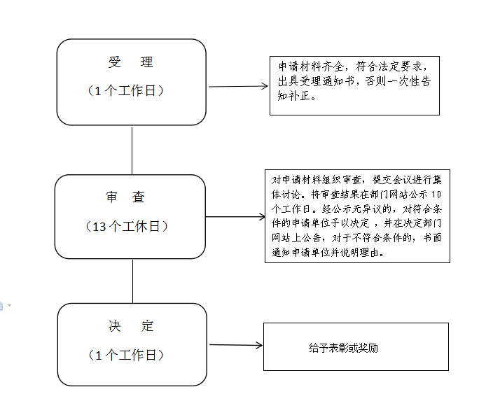 (1)申请:申请人通过政务服务网、办事大厅进行事项的申请,提交有关申请材料和反映真实情况,并对其申请材料实质内容的真实性负责。 (2)受理:办事大厅接收申报材料,所交材料齐全的,签发《材料接收凭证》;如所交材料齐全,做出受理决定,并签发。