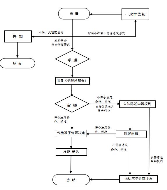 环节名称:收件 ;办理人:窗口收件人员;办理时限:即收;审查标准:申请人向许可机关窗口提交申请材料,或在河南政务服务网进行网上申报,并选择结果送达方式。;办理结果:符合申请条件转交窗口受理人员办理。; 环节名称:受理 ;办理人:窗口受理人员;办理时限:1天;审查标准:对申请材料进行初步审核。经审核,申请材料齐全、符合法定形式的,决定予以受理。对申请材料不齐全或者不符合法定形式的,应当当场告知申请人需要补正的全部内容并即时决定不予受理,并告知申请人。;办理结果:1. 材料齐全符合法定形式的出具《受理通知书》; 2.材料不齐全或不符合法定形式的出具《不予受理通知书》。; 环节名称:审核 ;办理人:窗口许可审核人员;办理时限:1天;审查标准:提交材料是否齐全、是否符合法定形式;材料需要核实的,核实相关材料。;办理结果:对于审核通过的,作出准予许可决定;对于审核不通过的,作出不予行政许可的决定。; 环节名称:决定 ;办理人:窗口许可决定人员;办理时限:1天;审查标准:根据审核情况,作出准予或不予行政许可的决定。;办理结果:1.做出准予许可决定的,送达相关文书; 2.做出不予行政许可决定的,送达《不予许可决定书》; 环节名称:送达 ;办理人:窗口送达人员;办理时限:1天;审查标准:根据申请人选择的送达方式送达结果文件。;办理结果:送达完成,许可流程结束。;